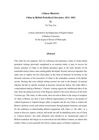 This study has two purposes: first, by collecting and examining a body of China-related periodical writings previously unexplored as an assorted whole, it aims to recover the literary presence of China in the British periodical space in the early decades of the nineteenth century when a mass reading public developed. Second, and more important, this study aims to explore the role China plays in this body of literature by focusing on the domestic relevance of the invocation of China to the immediate concerns of the British society. Positing that cross-cultural writing answers not only to the dynamic of national relations but also to specific moments in domestic and private history, this study offers a contextualised reading of Britain’s ‘Chinese’ writings against the multifaceted ethos of the time, from the political activism of the Regency period to the social advocacy of the early Victorian age. This study, in other words, does not seek to dilate on the image or reception of China in Britain, nor does it look at British representation of China as the product of cultural hegemony or imperial design; rather, it enquires into the way China is written into Britain’s political, social, and cultural consciousness through popular literature, and argues for the usefulness in understanding British engagement with China, or ‘the other’, as a means to discover, express, criticise, and rectify the self. In identifying such a use of China as ‘Chinese rhetoric’, this study ultimately calls attention to an ‘instrumental’ aspect of British orientalism that hinges on an autocritical and self-reflexive interest, an interest that renders China, or more generally the Orient, a pliant agency of literary expression.