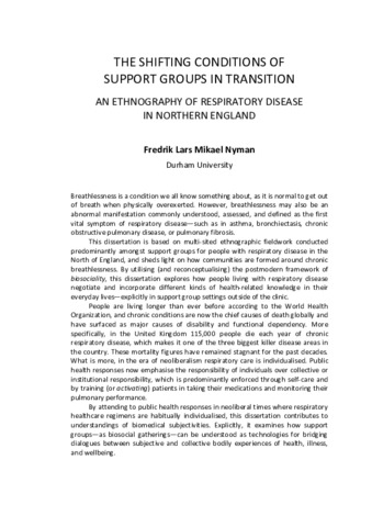 Breathlessness is a condition we all know something about, as it is normal to get out of breath when physically overexerted. However, breathlessness may also be an abnormal manifestation commonly understood, assessed, and defined as the first vital symptom of respiratory disease—such as in asthma, bronchiectasis, chronic obstructive pulmonary disease, or pulmonary fibrosis. This dissertation is based on multi-sited ethnographic fieldwork conducted predominantly amongst support groups for people with respiratory disease in the North of England, and sheds light on how communities are formed around chronic breathlessness. By utilising (and reconceptualising) the postmodern framework of biosociality, this dissertation explores how people living with respiratory disease negotiate and incorporate different kinds of health-related knowledge in their everyday lives—explicitly in support group settings outside of the clinic. People are living longer than ever before according to the World Health Organization, and chronic conditions are now the chief causes of death globally and have surfaced as major causes of disability and functional dependency. More specifically, in the United Kingdom 115,000 people die each year of chronic respiratory disease, which makes it one of the three biggest killer disease areas in the country. These mortality figures have remained stagnant for the past decades. What is more, in the era of neoliberalism respiratory care is individualised. Public health responses now emphasise the responsibility of individuals over collective or institutional responsibility, which is predominantly enforced through self-care and by training (or activating) patients in taking their medications and monitoring their pulmonary performance. By attending to public health responses in neoliberal times where respiratory healthcare regimens are habitually individualised, this dissertation contributes to understandings of biomedical subjectivities. Explicitly, it examines how support groups—as biosocial gatherings—can be understood as technologies for bridging dialogues between subjective and collective bodily experiences of health, illness, and wellbeing.