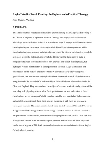 This thesis describes research undertaken into church planting in the Anglo-Catholic wing of the Church of England as a piece of Practical Theology and engages also with areas of missiology and ecclesiology. It does it in a number of ways. It engages with literature around church planting and the tension between the whole Fresh Expressions agenda, of which church planting is one element, and the traditional role of the historic parish and its church. It also looks at specific historical Anglo-Catholic literature as the thesis aims to make a comparison between Victorian builders of new churches and church planting today, but highlights two less noted leaders in the expansion of Victorian Anglo-Catholicism and concentrates on the work of these two specific Victorians as a way of avoiding over-generalisation, but also because as they had not been referenced in much of the literature as being leaders in the revival of Catholic worship or the establishment of new churches in the Church of England. They have not been the subject of previous academic study, but as will be seen, they both played significant roles. Participant observation was undertaken in three church plants, set up by Anglo-Catholic parishes, monthly over a period of eighteen months, and detailed descriptions of these plants and my engagement with them are provided in subsequent chapters. The research method used was a limited version of Grounded Theory as it supports the methodology of Practical Theology. This then enabled me to use a thematic analysis to draw out six themes, common in differing degrees to each church. I was then able to apply these themes to the Victorian subjects and their work to establish some important similarities of approach. This leads to a conclusion with recommendations for future Anglo-Catholic church planting.