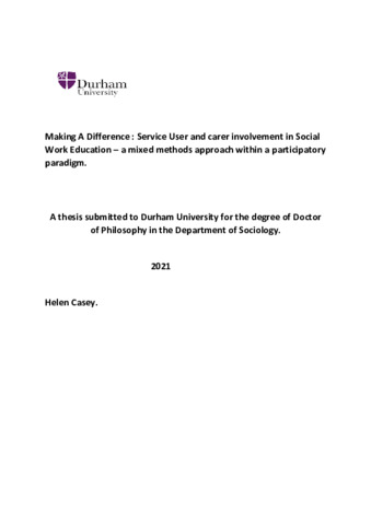 Making A Difference : Service User and carer involvement in Social Work Education – a mixed methods approach within a participatory paradigm.