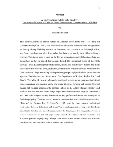 This thesis examines the literary careers of Christian Isobel Johnstone (1781-1857) and Catherine Gore (1798-1861), two successful and distinctive women writers marginalized in literary history. Existing research on Johnstone, best known as an Edinburgh editor, and Gore, a well-known silver fork author, has been separated by their different literary contexts. This thesis aims to uncover the literary connections and collaborations between the authors as they navigated their careers through the transitional period of the 1820s through 1840s. Examining their short stories, letters, and collaborative fiction, the thesis shows how their unusual plots, characters, and narrative concerns allowed Johnstone and Gore to attract a large readership while promoting surprisingly radical and proto-feminist agendas. Two short stories, Johnstone’s ‘The Experiences of Richard Taylor, Esq.’ and Gore’s ‘The Maid of Honour’, dismantle traditional gender norms, rearrange traditional heroic narratives, and imagine subtly new social identities for men and women. Original manuscript research examines the authors’ letters to the editors Richard Bentley and William Tait and the publisher George Boyd. This correspondence displays Johnstone’s and Gore’s challenge to portray themselves as both professional writers and exemplars of feminine propriety. The final part of the thesis considers their work of collaborative fiction, ‘Tales of the Cleikum Inn, St. Ronan’s’ (1837), and the lesser known professional relationship between Johnstone and Gore. The central argument developed in this thesis complicates familiar accounts of literary history by focusing on two marginalized women writers whose careers did not align neatly with the boundaries of the Romantic and Victorian periods, highlighting through their works some hidden connections between canonical and non-canonical writers, editors, and publishers.