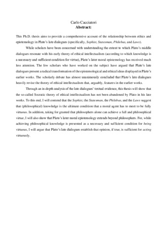 This Ph.D. thesis aims to provide a comprehensive account of the relationship between ethics and epistemology in Plato’s late dialogues (specifically, Sophist, Statesman, Philebus, and Laws). While scholars have been concerned with understanding the extent to which Plato’s middle dialogues resonate with his early theory of ethical intellectualism (according to which knowledge is a necessary and sufficient condition for virtue), Plato’s later moral epistemology has received much less attention. The few scholars who have worked on the subject have argued that Plato’s late dialogues present a radical transformation of the epistemological and ethical ideas displayed in Plato’s earlier works. The scholarly debate has almost unanimously concluded that Plato’s late dialogues heavily revise the theory of ethical intellectualism that, arguably, features in the earlier works. Through an in-depth analysis of the late dialogues’ textual evidence, this thesis will show that the so-called Socratic theory of ethical intellectualism has not been abandoned by Plato in his late works. To this end, I will contend that the Sophist, the Statesman, the Philebus, and the Laws suggest that (philosophical) knowledge is the ultimate condition that a moral agent has to meet to be fully virtuous. In addition, taking for granted that philosophers alone can achieve a full and philosophical virtue, I will also show that Plato’s later moral epistemology extends beyond philosophers. For, while achieving philosophical knowledge is presented as a necessary and sufficient condition for being virtuous, I will argue that Plato’s late dialogues establish that opinion, if true, is sufficient for acting virtuously.