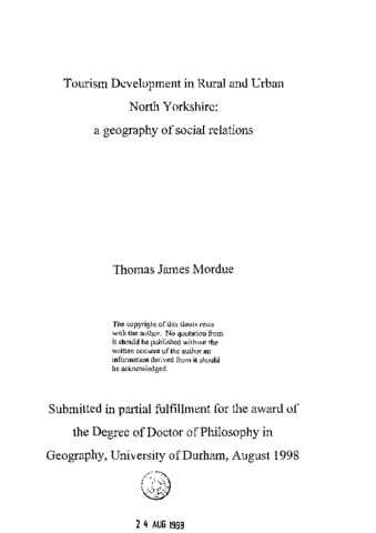 Tourism development in rural and urban North Yorkshire : a geography of social relations.