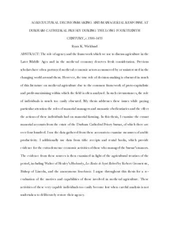 ABSTRACT: The role of agency and the framework which we use to discuss agriculture in the Later Middle Ages and in the medieval economy deserves fresh consideration. Previous scholars have often portrayed medieval economic actors as unmoved by or uninterested in the changing world around them. However, the true role of decision-making is obscured in much of this literature on medieval agriculture due to the common framework of proto-capitalistic and profit-maximising within which the field is often analysed. In such circumstances, the role of individuals is much too easily obscured. My thesis addresses these issues while paying particular attention the roles of manorial managers and monastic obedientiaries and the effect the actions of these individuals had on manorial farming. In this thesis, I examine the extant manorial accounts from the estate of the Durham Cathedral Priory bursar, of which there are over four hundred. I use the data gathered from these accounts to examine measures of arable productivity. I additionally use data from tithe receipts and rental books, which provide evidence for the extra-demesne economic activities of those who managed the bursar’s manors. The evidence from these sources is then examined in light of the agricultural treatises of the period, including Walter of Henley’s Husbandry, Les Reules de Seynt Roberd by Robert Grosseteste, Bishop of Lincoln, and the anonymous Senechausie. I argue throughout this thesis for a re- evaluation of the motives and capabilities of those involved in medieval agriculture. These activities of these very capable individuals too easily become lost when careful analysis is not undertaken to deliberately restore their agency.