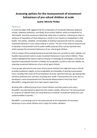 A recent paradigm shift suggests that the components of movement behaviour (physical activity, sedentary behaviour, and sleep) of pre-school children, which are important for child health, should be examined collectively rather than in isolation. Furthermore, there is evidence of inequalities of these behaviours, which in turn impacts on inequalities in child health. The validity, reliability, and feasibility of existing measurement tools for assessing movement behaviour in pre-school children is unclear. The aim of this doctoral research was to develop a measurement tool for public health purposes (thus a proxy reported tool) which assesses the movement behaviours of pre-school aged children. Critical reviews of the existing literature found that there are currently no valid, reliable, and feasible measurement tools to assess movement behaviours in pre-school children. These reviews highlighted the need to address this gap in knowledge by developing a novel proxy reported measurement tool that is feasible and acceptable, as well as valid and reliable, for assessing movement behaviours of pre-school aged children. Focus groups with parents and carers of pre-school children from deprived areas in the UK provided qualitative insights on the acceptability and feasibility of existing measurement tools, including their views on the presentation of proxy reported tools (e.g. age appropriate activities, preference for real-time recording over recall). These parents and carers also co-developed a novel measurement tool ‘Movement Measurement in the Early Years’ (MoveMEY), alongside input from topic expert researchers. Working with a different group of pre-school children and their parents and carers, MoveMEY was pilot tested to determine the content validity of the tool. The tool was found to comprise of relevant items, be comprehensive of children’s movement behaviours, and understandable to parents. MoveMEY is a promising tool for the measurement of all components of movement behaviours in pre-school children and is ready for further validation.
