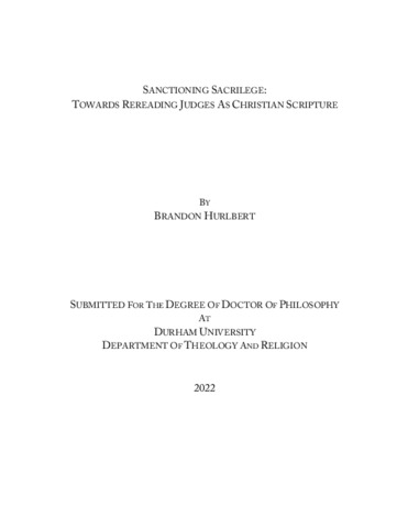 This dissertation presents fresh readings of several episodes within the book of Judges and offers hermeneutical suggestions as a way towards rereading Judges as Christian Scripture. Reading with the grain of the text, I argue that several narratives are “sanctioning sacrilege” — they are condemning the characters and their actions not only when read as part of Israel’s Scriptures but also when reread as Christian Scripture. Chapter 1 surveys the reception of the Curse of Meroz (Judg. 5:23) in 18th century Britain and colonial America to provide a sympathetic account of how Christians in similar social settings could read and use a single verse from the book of Judges in a variety of ways. Chapter 2 offers a fresh interpretation of the Ehud narrative (Judg. 3:12-30) which rereads the protagonist as an anti-hero whose methods of deliverance are incongruous with the way YHWH has chosen to act through Israel. Ehud’s violent actions, though they effect liberation, are presented in a way that may appear more sinister when read as part of Israel’s Scriptures. Chapter 3 focuses on the concept of exemplarity and its resistance in early Jewish and Christian receptions of Samson. Chapter 4 continues to explore the characterisation of Samson within Israel’s Scriptures. The final chapter highlights the cultic dimension of Judges 17-21 and its thematic resonances within Judges and the Deuteronomistic History to argue that the refrain is a call for Israel’s leader—whoever that may be—to recommit to following YHWH and to lead Israel in doing what is right in YHWH’s eyes. It is argued that the function of Judges 17-21 is to provide a retrospective analysis of the problems Israel faces within the book of Judges, namely that the corrosion of Israelite society began with the corruption of the priesthood.