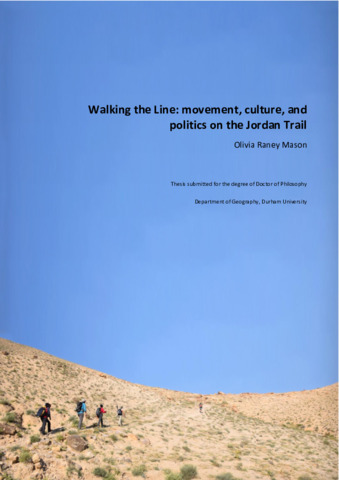 This thesis examines the intersections of movement and cultural politics along the Jordan Trail, a 650km long-distance walking trail in the Middle East. It aims to reorientate political geographical accounts of Jordan to the everyday, intimate, and embodied scale through an exploration of the Jordan Trail and the bodies who walk it. This thesis argues that walking bodies on the Jordan Trail capture intimate and embodied accounts of place that speak back to state-centric accounts of Jordan. This thesis proposes a politics of movement that steps away from Eurocentric and Anglo-American accounts of movement and brings political geography and cultural geography into conversation. By exploring cultural practices in Jordan, this thesis foregrounds and analyses accounts of place that have been neglected within current explorations of Jordan and within cultural geography as a discipline. Through 12 months of ethnographic fieldwork in Jordan and around 2,000 hours on the Jordan Trail, this thesis syntheses and innovates cultural politics and movement in three ways. First, this thesis explores the production of the line of the Jordan Trail and how movements that challenge those of colonial border drawing are captured by the Trail. Second, by interacting with bodies that walk on the Trail I explore how embodied and intimate relationships with land challenge territorial nationalist claims and capture alternative and indigenous narratives and relationships with place. Third, I argue walking creates moments for new political communities to form. It creates moments for Jordanians, Bedouins, and international tourists to touch. These moments of touch bring bodies, objects, and animals into proximity to create meaningful interactions. This thesis concludes that examining a long-distance walking trail brings together political and cultural geography to speak back to state-centric and colonial narratives, explore a non-Eurocentric politics of movement, and capture intimate, indigenous, and embodied relationships with place.