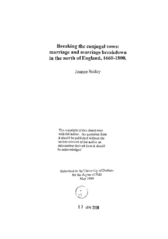Breaking the conjugal vows : marriage and marriage breakdown in the north of England, 1660-1800.