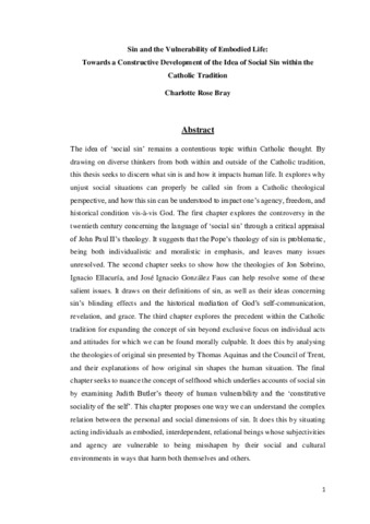 The idea of ‘social sin’ remains a contentious topic within Catholic thought. By drawing on diverse thinkers from both within and outside of the Catholic tradition, this thesis seeks to discern what sin is and how it impacts human life. It explores why unjust social situations can properly be called sin from a Catholic theological perspective, and how this sin can be understood to impact one’s agency, freedom, and historical condition vis-à-vis God. The first chapter explores the controversy in the twentieth century concerning the language of ‘social sin’ through a critical appraisal of John Paul II’s theology. It suggests that the Pope’s theology of sin is problematic, being both individualistic and moralistic in emphasis, and leaves many issues unresolved. The second chapter seeks to show how the theologies of Jon Sobrino, Ignacio Ellacuría, and José Ignacio González Faus can help resolve some of these salient issues. It draws on their definitions of sin, as well as their ideas concerning sin’s blinding effects and the historical mediation of God’s self-communication, revelation, and grace. The third chapter explores the precedent within the Catholic tradition for expanding the concept of sin beyond exclusive focus on individual acts and attitudes for which we can be found morally culpable. It does this by analysing the theologies of original sin presented by Thomas Aquinas and the Council of Trent, and their explanations of how original sin shapes the human situation. The final chapter seeks to nuance the concept of selfhood which underlies accounts of social sin by examining Judith Butler’s theory of human vulnerability and the ‘constitutive sociality of the self’. This chapter proposes one way we can understand the complex relation between the personal and social dimensions of sin. It does this by situating acting individuals as embodied, interdependent, relational beings whose subjectivities and agency are vulnerable to being misshapen by their social and cultural environments in ways that harm both themselves and others.