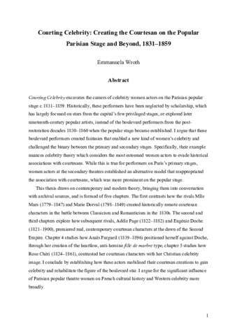 Courting Celebrity excavates the careers of celebrity women actors on the Parisian popular stage c.1831–1859. Historically, these performers have been neglected by scholarship, which has largely focused on stars from the capital’s few privileged stages, or explored later nineteenth-century popular artists, instead of the boulevard performers from the post-restoration decades 1830–1860 when the popular stage became established. I argue that these boulevard performers created fantasies that enabled a new kind of women’s celebrity and challenged the binary between the primary and secondary stages. Specifically, their example nuances celebrity theory which considers the most esteemed women actors to evade historical associations with courtesans. While this is true for performers on Paris’s primary stages, women actors at the secondary theatres established an alternative model that reappropriated the association with courtesans, which was more prominent on the popular stage. This thesis draws on contemporary and modern theory, bringing them into conversation with archival sources, and is formed of five chapters. The first contrasts how the rivals Mlle Mars (1779–1847) and Marie Dorval (1798–1849) created historically remote courtesan characters in the battle between Classicism and Romanticism in the 1830s. The second and third chapters explore how subsequent rivals, Adèle Page (1822–1882) and Eugénie Doche (1821–1900), premiered real, contemporary courtesan characters at the dawn of the Second Empire. Chapter 4 studies how Anaïs Fargueil (1819–1896) positioned herself against Doche, through her creation of the heartless, anti-heroine fille de marbre type; chapter 5 studies how Rose Chéri (1824–1861), contrasted her courtesan characters with her Christian celebrity image. I conclude by establishing how these actors mobilised their courtesan creations to gain celebrity and rehabilitate the figure of the boulevard star. I argue for the significant influence of Parisian popular theatre women on French cultural history and Western celebrity more broadly.