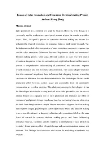 Sales promotion is a common tool used by retailers. However, even though it is commonly used in marketplace, sometimes it cannot achieve the results as retailers expect. Thus, the specific process of consumer decision making and factors that influence the effect of promotions on consumer behavior need further research. This thesis is composed of a literature review of sales promotions, consumers response to a specific sales promotion (Minimum Purchase Requirement deal), and consumers’ decision-making process when using different symbols to shop. The first chapter presents an integrative review to summarize past empirical or theoretical literature to provide a comprehensive understanding of consumers’ and marketers’ response towards monetary and non-monetary sales promotion. The second chapter examines how the consumer’s regulatory focus influences their shopping behavior when they choose to use Minimum Purchase Requirement deals. The third chapter focuses on the interaction effect between symbol usage and personality traits on consumer’s consideration set in online shopping. The relationship among the three chapters is that the first chapter reviews the existing research about sales promotion, and the second chapter focuses on a specific type of sales promotion and examines the effect of consumers’ goal pursuit strategy (regulatory focus) on purchasing behavior when using the deal. Even though the third chapter focuses on external triggered decision-making cues (symbol usage), psychological factors (personality traits) and decision-making process (consideration set) in shopping rather than sales promotions, it follows the same thread of research in consumer decision making process and factors influencing consumer behavior. The thesis aims to contribute to the literature of sales promotion, regulatory focus, priming effect of symbol usage and consumer decision making and behavior. The findings have important implications for marketing practitioners and retailers.