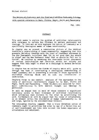 The notion of coadunacy and the problem of self/other relationality in theology with special reference to Kant, Fichte, Hegel, Barth and Pannenberg.