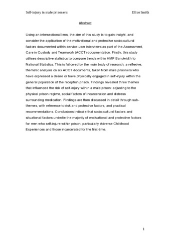 Using an intersectional lens, the aim of this study is to gain insight, and consider the application of the motivational and protective socio-cultural factors documented within service-user interviews as part of the Assessment, Care in Custody and Teamwork (ACCT) documentation. Firstly, this study utilises descriptive statistics to compare trends within HMP Bandwidth to National Statistics. This is followed by the main body of research: a reflexive, thematic analysis on six ACCT documents, taken from male prisoners who have expressed a desire or have physically engaged in self-injury within the general population of the reception prison. Findings revealed three themes that influenced the risk of self-injury within a male prison: adjusting to the physical prison regime, social factors of incarceration and distress surrounding medication. Findings are then discussed in detail through sub-themes, with reference to risk and protective factors, and practical recommendations. Conclusions indicate that socio-cultural factors and situational factors underlie the majority of motivational and protective factors for men who self-injure within prison, particularly Adverse Childhood Experiences and those incarcerated for the first-time.
