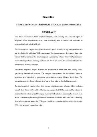 This thesis encompasses three empirical chapters, each focusing on a distinct aspect of corporate social responsibility (CSR) and examining both its drivers and outcomes at organizational and individual levels. The first empirical chapter investigates the role of gender diversity in top management teams and its relationship with firms’ CSR engagement. Drawing on resource dependence theory, the primary findings indicate that female directors significantly enhance firm's CSR performance by contributing to board diversity. Furthermore, the results reveal that social trust bolsters the effectiveness of female directors. The second empirical chapter explores the environmental issues and their driving factor, specifically institutional investors. The analysis demonstrates that institutional investors contribute to a reduction in greenhouse gas emissions among Chinese listed firms. The mechanism operates through the investors’ use of their voice in shareholder proposals. The final empirical chapter delves into external experiences that influence CEOs' attitudes towards their firms' CSR profiles. The findings suggest that CEOs, motivated by a desire to enhance their reputation, tend to engage more in CSR activities following the receipt of an award. Concurrently, the easing of financial constraints facilitates these decisions. Ultimately, the results support the notion that CSR agency problems can lead to decisions made by awarded CEOs that adversely impact firm value.