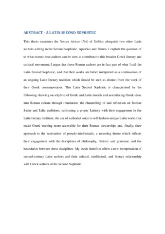 This thesis examines the Noctes Atticae (NA) of Gellius alongside two other Latin authors writing in the Second Sophistic, Apuleius and Fronto. I explore the question of to what extent these authors can be seen to contribute to this broader Greek literary and cultural movement; I argue that these Roman authors are in fact part of what I call the Latin Second Sophistic, and that their works are better interpreted as a continuation of an ongoing Latin literary tradition which should be seen as distinct from the work of their Greek contemporaries. This Latin Second Sophistic is characterised by the following: drawing on a hybrid of Greek and Latin models and assimilating Greek ideas into Roman culture through translation; the channelling of and reflection on Roman Satire and Italic traditions; cultivating a proper Latinity with their engagement in the Latin literary tradition; the use of authorial voice to self-fashion unique Latin works that make Greek learning more accessible for their Roman viewership; and, finally, their approach to the satirisation of pseudo-intellectuals, a recurring theme which reflects their engagement with the disciplines of philosophy, rhetoric and grammar, and the boundaries between these disciplines. My thesis therefore offers a new interpretation of second-century Latin authors and their cultural, intellectual, and literary relationship with Greek authors of the Second Sophistic.