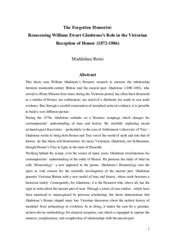 This thesis uses William Gladstone’s Homeric research to reassess the relationship between nineteenth-century Britain and the ancient past. Gladstone (1809-1898), who served as Prime Minister four times during the Victorian period, has often been dismissed as a scholar of Homer: too enthusiastic, too much of a dilettante, too ready to cast aside evidence. But, through a careful examination of unstudied archival evidence, it is possible to build a very different picture. During the 1870s, Gladstone embarks on a Homeric campaign which changes his contemporaries’ understanding of time and history. By carefully exploiting recent archaeological discoveries – particularly in the case of Schliemann’s discovery of Troy – Gladstone works to bring both Homer and Troy out of the world of myth and into that of history. As this thesis will demonstrate, for many Victorians, Gladstone, not Schliemann, brought Homer’s Troy to light, in the ruins of Hissarlik. Working behind the scenes, over the course of many years, Gladstone revolutionises his contemporaries’ understanding of the study of Homer. He pioneers the study of what he calls ‘Homerology’: a new approach to the poems. Gladstone’s Homerology sees the epics as vital sources for the scientific investigation of the ancient past. Gladstone presents Victorian Britain with a new model of time and history, where myth becomes a historical reality. Consequently, for Gladstone, it is the Homerist who, above all, has the right to write about the ancient past of man. Through a series of case studies - which have been unnoticed or unrecognised by previous scholarship, this thesis demonstrates that Gladstone’s Homer shaped many key Victorian discourses about the earliest history of mankind: from archaeology to evolution. In so doing, it makes the case for a granular, archive-driven methodology for classical reception, one which is equipped to capture the nuances, complications, and complexities of relationships with the ancient past.