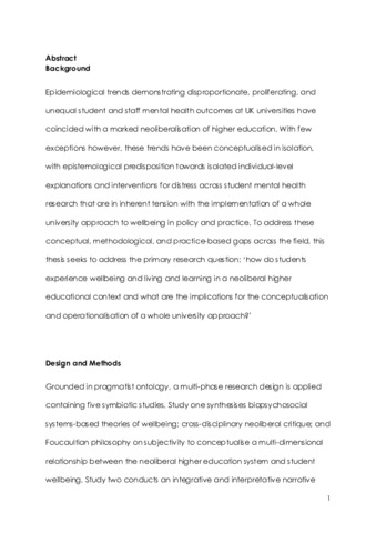 Background Epidemiological trends demonstrating disproportionate, proliferating, and unequal student and staff mental health outcomes at UK universities have coincided with a marked neoliberalisation of higher education. With few exceptions however, these trends have been conceptualised in isolation, with epistemological predisposition towards isolated individual-level explanations and interventions for distress across student mental health research that are in inherent tension with the implementation of a whole university approach to wellbeing in policy and practice. To address these conceptual, methodological, and practice-based gaps across the field, this thesis seeks to address the primary research question: ‘how do students experience wellbeing and living and learning in a neoliberal higher educational context and what are the implications for the conceptualisation and operationalisation of a whole university approach?’ Design and Methods Grounded in pragmatist ontology, a multi-phase research design is applied containing five symbiotic studies. Study one synthesises biopsychosocial systems-based theories of wellbeing; cross-disciplinary neoliberal critique; and Foucaultian philosophy on subjectivity to conceptualise a multi-dimensional relationship between the neoliberal higher education system and student wellbeing. Study two conducts an integrative and interpretative narrative literature review to identify the social, academic, and financial determinants of student wellbeing within the context of the neoliberal higher education system. Study three utilises a cross-sectional survey with a national sample of 815 undergraduate and postgraduate students to identify the prevalence, variance, and associations of salient social, academic, and financial determinants of wellbeing with identifiable socio-material and socio-psychological neoliberal conditions. Study four performs ten student focus groups to explore student experiential narratives of wellbeing and living and learning in the neoliberal system, whilst eliciting recommendations for policy and practice. Study five uses expert interviews with nine relevant stakeholders to explore the influence of neoliberal socio-material and socio-psychological conditions on service delivery and elucidate recommendations for the conceptualisation and operationalisation of a whole university approach. Findings Taken together, the findings present preliminary evidence that identifiable neoliberal higher education principles and policies mediate student exposure, both socio-materially and socio-psychologically, to academic, social, and financial determinants which demonstrably, detrimentally, and differentially impact on subjective wellbeing. It is argued therefore that pragmatic conceptualisation and operationalisation of a whole university approach must be contextualised within the neoliberal higher education system. Implications for policy, practice, and research are presented.