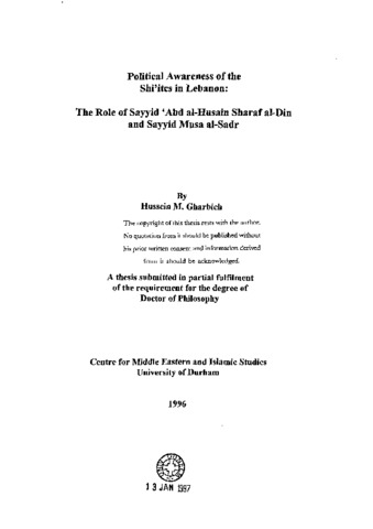 bPolitical awareness of the Shi'ites in Lebanon : the role of Sayyid #Abd al-Husain Sharaf al-Din and Sayyid Musa al-Sadr.