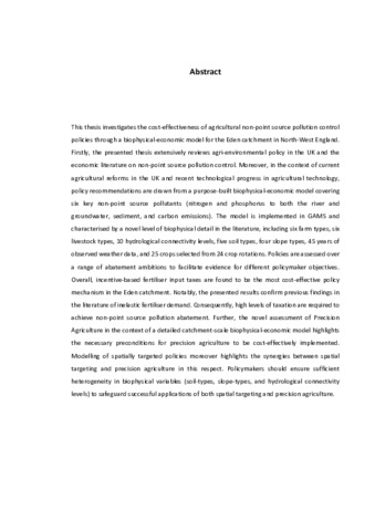 This thesis investigates the cost-effectiveness of agricultural non-point source pollution control policies through a biophysical-economic model for the Eden catchment in North-West England. Firstly, the presented thesis extensively reviews agri-environmental policy in the UK and the economic literature on non-point source pollution control. Moreover, in the context of current agricultural reforms in the UK and recent technological progress in agricultural technology, policy recommendations are drawn from a purpose-built biophysical-economic model covering six key non-point source pollutants (nitrogen and phosphorus to both the river and groundwater, sediment, and carbon emissions). The model is implemented in GAMS and characterised by a novel level of biophysical detail in the literature, including six farm types, six livestock types, 10 hydrological connectivity levels, five soil types, four slope types, 45 years of observed weather data, and 25 crops selected from 24 crop rotations. Policies are assessed over a range of abatement ambitions to facilitate evidence for different policymaker objectives. Overall, incentive-based fertiliser input taxes are found to be the most cost-effective policy mechanism in the Eden catchment. Notably, the presented results confirm previous findings in the literature of inelastic fertiliser demand. Consequently, high levels of taxation are required to achieve non-point source pollution abatement. Further, the novel assessment of Precision Agriculture in the context of a detailed catchment-scale biophysical-economic model highlights the necessary preconditions for precision agriculture to be cost-effectively implemented. Modelling of spatially targeted policies moreover highlights the synergies between spatial targeting and precision agriculture in this respect. Policymakers should ensure sufficient heterogeneity in biophysical variables (soil-types, slope-types, and hydrological connectivity levels) to safeguard successful applications of both spatial targeting and precision agriculture
