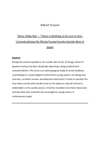‘Shinu Shika Nai’ – ‘There is Nothing to Do but to Die’: Contextualising the Rising Young Female Suicide Rate in Japan.