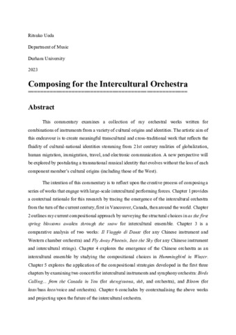 This commentary examines a collection of my orchestral works written for combinations of instruments from a variety of cultural origins and identities. The artistic aim of this endeavour is to create meaningful transcultural and cross-traditional work that reflects the fluidity of cultural-national identities stemming from 21st century realities of globalization, human migration, immigration, travel, and electronic communication. A new perspective will be explored by postulating a transnational musical identity that evolves without the loss of each component member’s cultural origins (including those of the West). The intention of this commentary is to reflect upon the creative process of composing a series of works that engage with large-scale intercultural performing forces. Chapter 1 provides a contextual rationale for this research by tracing the emergence of the intercultural orchestra from the turn of the current century, first in Vancouver, Canada, then around the world. Chapter 2 outlines my current compositional approach by surveying the structural choices in as the first spring blossoms awaken through the snow for intercultural ensemble. Chapter 3 is a comparative analysis of two works: Il Viaggio di Dante (for any Chinese instrument and Western chamber orchestra) and Fly Away Phoenix, Into the Sky (for any Chinese instrument and intercultural strings). Chapter 4 explores the emergence of the Chinese orchestra as an intercultural ensemble by studying the compositional choices in Hummingbird in Winter. Chapter 5 explores the application of the compositional strategies developed in the first three chapters by examining two concerti for intercultural instruments and symphony orchestra: Birds Calling… from the Canada in You (for sheng/suona, shō, and orchestra), and Bloom (for koto/bass koto/voice and orchestra). Chapter 6 concludes by contextualising the above works and projecting upon the future of the intercultural orchestra.