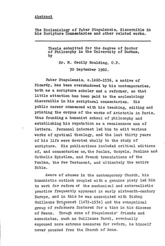 The ecclesiology of Faber Stapulensis, discenible in his scripture commentaries and other related works.