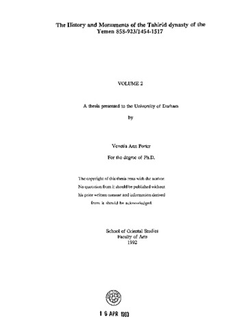 The history and monuments of the Tahirid dynasty of the Yemen 858-923/1454-1517.