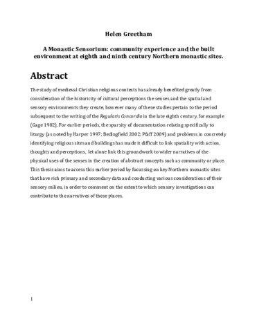 The study of medieval Christian religious contexts has already benefited greatly from consideration of the historicity of cultural perceptions the senses and the spatial and sensory environments they create, however many of these studies pertain to the period subsequent to the writing of the Regularis Concordia in the late eighth century, for example (Gage 1982). For earlier periods, the sparsity of documentation relating specifically to liturgy (as noted by Harper 1997; Bedingfield 2002; Pfaff 2009) and problems in concretely identifying religious sites and buildings has made it difficult to link spatiality with action, thoughts and perceptions, let alone link this groundwork to wider narratives of the physical uses of the senses in the creation of abstract concepts such as community or place. This thesis aims to access this earlier period by focussing on key Northern monastic sites that have rich primary and secondary data and conducting various considerations of their sensory milieu, in order to comment on the extent to which sensory investigations can contribute to the narratives of these places.