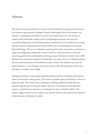 This thesis examines the faith lives of women from the Christian Charismatic church network Newfrontiers using a practical theological research methodology. Data for the research was collected via participant observations of services and research interviews. This research is situated within Charismatic theology and the methodological processes stem from this commitment. Making use of Charismatic practices of testimony to hear experiences of meeting God and accounts of oppressions this research offers a novel methodology for Charismatic Practical Theology. The review of literature concerning this church network shows that there is a a gap in knowledge about Charismatic women’s faith lives with most research in this field concerning gender and complementarian church governance. Research by Kristin Aune in 2001 described the construction of gender in Newfrontiers; it is, along with my own Masters research, the only academic treatment of Newfrontiers women. Kristin Aune describes the use of the Jezebel narrative in 1 and 2 Kings as part of the network’s self-understanding of women who seek power in churches and marriage. Hearing the testimony of the research participants allowed for the construction of the primary theme in the research: making a place. This theme is expanded upon by describing it in terms of epistemic justice. The women can be understood as suffering epistemic injustice that they negotiate using the power of the Holy Spirit in their lives. A hermeneutic of Newfrontiers women is created from the data and a new reading of the story of Jezebel is offered. The research suggests that this is not a fitting way to describe women in Newfrontiers but rather the biblical character of Elizabeth is suitable.