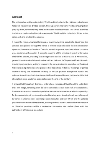 The philosopher and heresiarch John Wyclif and the Lollards, the religious radicals who followed, have always divided opinion. Held up as reformers and models of evangelical piety by some, for others they were heretics and insurrectionists. This thesis examines the hitherto neglected subject of responses to Wyclif and the Lollards in Britain in the eighteenth and nineteenth centuries. It maps the historiographical landscape, examining writing about John Wyclif and the Lollards as it passed through the hands of writers situated across the denominational spectrum from nonconformist to Catholic, as well as general historians whose concerns were predominantly secular. It seeks to examine all the principal types of writers who entered the debate, including the abridgers and editors of Foxe’s Acts & Monuments, general historians who followed the lead of Paul de Rapin de Thoyras and David Hume in the eighteenth century, and John Lingard in the early nineteenth, as well as confessional historians and polemicists who produced ecclesiastical histories. The range of genres widened during the nineteenth century to include popular evangelical novels and polemic, the writing of high churchmen like Dean Hook and Samuel Maitland and the first attempts at more academic analysis towards the end of the century. It argues that throughout this time, writers have reimagined Wyclif and the Lollards in their own image, rendering them as heroes or villains to suit their own preconceptions. No-one was neutral or even displayed what we now understand as academic objectivity. To demonstrate this, it contextualises the historiography, showing how it was influenced by trends in wider society, both religious and secular; and how Wyclif and the Lollards provided historians with antecedents, allowing them to situate their own denominational or historical positions within a contextual framework and endow them with the authenticity of historical precedent.