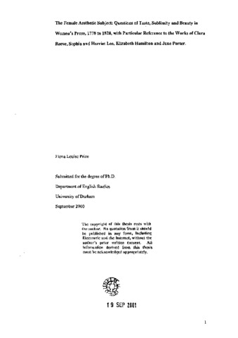 The female aesthetic subject : questions of taste, sublimity and beauty in women's prose, 1778 to 1828, with particular reference to the works of Clara Reeve, Sophia and Harriet Lee, Elizabeth Hamilton and Jane Porter.