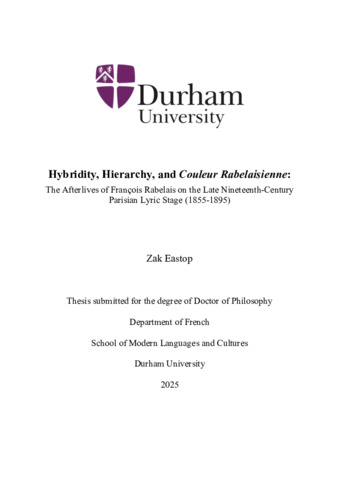 This thesis examines the late nineteenth-century lyric afterlife of the sixteenth-century writer François Rabelais by examining the four musico-theatrical ‘adaptations’ of his works that appeared on the lyric stages of Paris between 1855 and 1895. These are: Théodore Labarre and Henri Trianon’s Pantagruel (1855); Hervé, Clairville, and Octave Gastineau’s Panurge (1879); Louis Ganne, Oscar Méténier, and Jean-Louis Dubut de Laforest’s Rabelais (1892); and Robert Planquette, Henri Meilhac, and Albert de Saint-Albin’s Panurge (1895). On the basis of this material, the thesis addresses wider questions about the nature of the reception and reproduction of cultural artefacts. It interrogates the relationship between Rabelais’s texts and biography, their late nineteenth-century lyric afterlives, the period’s lyric culture (particularly its genre hierarchies), and ideas about the writer’s life and works that were in currency during that time. As well as using Rabelais’s reception in the nineteenth century as a tool with which to unravel some of the panoply of potential interpretations of his texts, this thesis demonstrates that in nineteenth-century imaginaries both Rabelais’s life and works were considered stylistic, registral, and social hybrids. This heterogeneity is the basis for what I term couleur rabelaisienne: in other words, a mode of historical representation that intersects literary and historical aesthetic discourses closely associated with Rabelais’s works and biography, particularly their supposed stylistic and social hybridity. Alongside its study of Rabelais’s lyric posterity, this thesis makes a case for an approach to the phenomenon we now call ‘adaptation’ that remains sensitive to details of its theorisation through history. By offering more flexible frameworks through which to deconstruct, reshape, and subvert the hierarchies implied in terms like ‘source’ and ‘adaptation’, I seek to open new avenues for understanding the myriads of ways in which cultural artefacts interrelate.