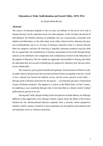 The success of education depends on how its aims are defined. At the fin-de-siècle and in George Gissing’s novels, education serves two main purposes: on the one hand, the pursuit of individualism, the Paterian drawing of multitudes into one consciousness, associated with dandies and dilettantism; on the other hand, social utility, which involves educating the poor, acts of philanthropy, and so on. In many of Gissing’s characters, there is a tension between these two purposes, and since all schooling is imperfect, education continues long into adult life. As argued here, the contradictions in Gissing’s presentation of the world through literary realism can be attributed to the complexities and contradictions involved in this bifurcation of the purpose of education. The two strands are apparently irreconcilable in Gissing, and where the individual does not succeed in identifying one purpose for education, they become exiles, if only intellectually. This research is given greater breadth and legitimacy by the inclusion of Marie Corelli, an author whose canonical status has wavered and whose fiction was popular in her day. Corelli is also a special case because her didactic novels, and her essays, promise social utility — through moral (Christian) instruction for the masses — yet ultimately provide a Christianised version of Paterian aesthetics. She appeals to a coterie, as did Walter Pater, yet that ‘coterie’, by exploiting a mass readership through what is here described as a literary kind of cultural performativity, proved to be vast. Gissing and Corelli, though working in the same period on similar themes, are strikingly different in their approaches, since Gissing’s literary realism shows the effects of the tension between the two aforementioned educative purposes from a minority culture perspective, whereas Corelli’s romance, limited by a mass readership, can only perform such cultural issues and ultimately serves as Christian inculcation.