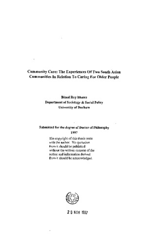 Community care : the experiences of two South Asian communities in relation to caring for older people.