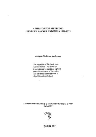 A mission for medicine : Dr Ellen Farrer and India 1891-1933.