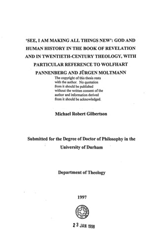 See, I am making all things new : God and human history in the Book of Revelation and in twentieth-century theology, with particular reference to Wolfhart Pannenberg and Jurgen Moltmann.