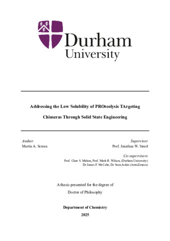 Proteolysis-targeting chimeras (PROTACs) represent a promising drug modality within the beyond Rule of Five (bRo5) chemical space but are hindered by extremely poor aqueous solubility and limited crystallisability, due to their flexible structures consisting of two ligand moieties joined chemically by a linker. While several X-ray structures have been reported of PROTACs in ternary complexes, to date no structures have been published of single-component densely packed PROTACs, from which an understanding of PROTACs’ intermolecular interactions, and therefore physical properties, can be developed. This thesis addresses these challenges through solid-state engineering approaches aimed at improving solubility and advancing pre-formulation strategies. The first single-component crystal structures of a cereblon-recruiting PROTAC ‘AZ1’ are reported, obtained via advanced crystallisation protocols combined with 3D electron diffraction and synchrotron X-ray diffraction. Despite their potential for hydrogen bonding, these structures are dominated by dispersive interactions, forming similar packing motifs across different crystalline forms. Generating amorphous phases of AZ1 by different methods can lead to distinct dissolution behaviours, suggesting that PROTACs can also exhibit pseudo-polyamorphism. Pre-formulation studies show that amorphous solid dispersions (ASDs) of PROTACs with HPMCAS polymer significantly enhance supersaturation upon dissolution compared to the pure amorphous drug, achievable at a relatively high weight-percentage of drug when synthesised via the slurry conversion method. In contrast, co-amorphous systems with small molecule co-formers failed to improve dissolution despite evidence of inter-component hydrogen bonding. Complementary crystallisation studies on lenalidomide, a molecular fragment of AZ1, explore low-solubility co-crystals for pulmonary drug delivery and gel-phase crystallisation to control polymorphism, highlighting novel avenues for managing solid state properties. Collectively, these findings contribute towards an understanding of how to overcome PROTACs’ poor pharmacokinetic properties through tailored solid-state strategies.
