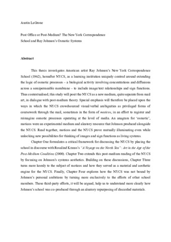 This thesis investigates American artist Ray Johnson’s New York Correspondence School (1962), hereafter NYCS, as a learning institution uniquely centred around extending the logic of osmotic processes – a biological activity involving concentrations and diffusions across a semipermeable membrane – to include image/text relationships and sign functions. Thus contextualised, this study will posit the NYCS as a new medium, quite separate from mail art, in dialogue with post-medium theory. Special emphasis will therefore be placed upon the ways in which the NYCS crowdsourced visual/verbal ambiguities as privileged forms of coursework through the mail, sometimes in the form of moticos, in an effort to register and reimagine osmotic processes operating at the level of media. An anagram for ‘osmotic’, moticos were an experimental medium and aleatory resource that Johnson produced alongside the NYCS. Read together, moticos and the NYCS prove mutually illuminating even while unlocking new possibilities for thinking of images and sign functions as living systems.