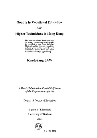 Quality in vocational education for higher technicians in Hong Kong.