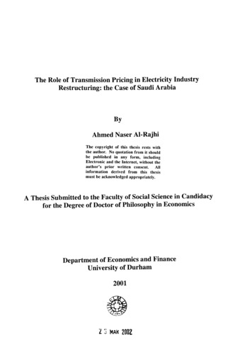 The role of transmission pricing in electricity industry restructuring : the case of Saudi Arabia.