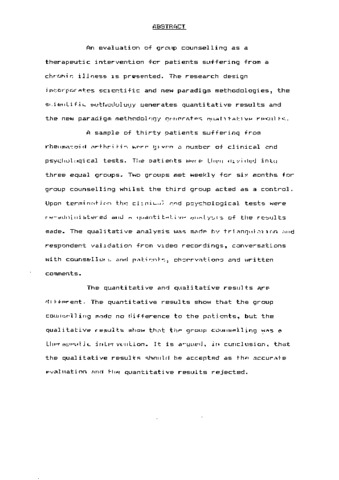 An evaluation of group counselling as a therapeutic intervention for patients suffering from a chronic illness with special reference to rheumatoid arthritis.