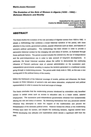 The evolution of the role of women in Algeria (1830-1992) : between rhetoric and reality.