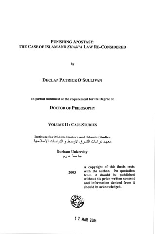 Punishing apostasy : the case of Islam and Shari'a law re-considered.