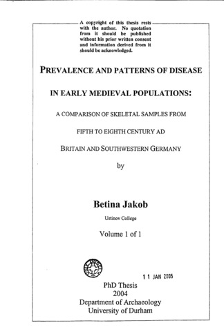 Prevalence and patterns of disease in early medieval populations : a comparison of skeletal samples from fifth to eighth century AD Britain and Southwestern Germany.