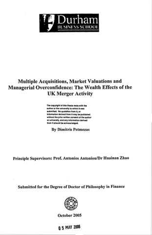 Multiple acquisitions, market valuations and menegerial overconfidence : the wealth effects of the UK merger activity