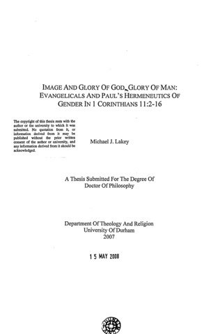 Image and glory of God, glory of man : Evangelicals and Paul's hermeneutics of gender in 1 Corinthians 11:2-16.