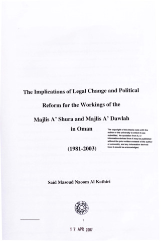 The implications of legal change and political reform for the workings of the Majlis A' Shura and Majlis A' Dawlah in Oman (1981-2003).