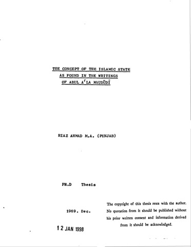 The concept of the Islamic State as found in the writings of Abul A' La Maududi.