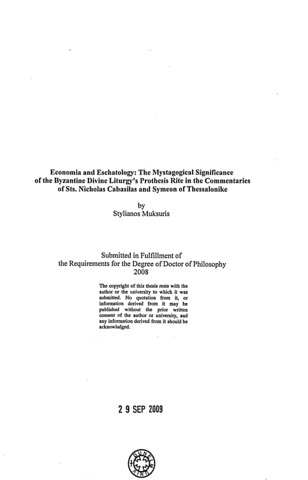 Economia and Eschatology: The Mystagogical Significance of the Byzantine Divine Liturgy's Prothesis Rite in the Commentaries of Saints Nicholas Cabasilas and Symeon Thessalonike.