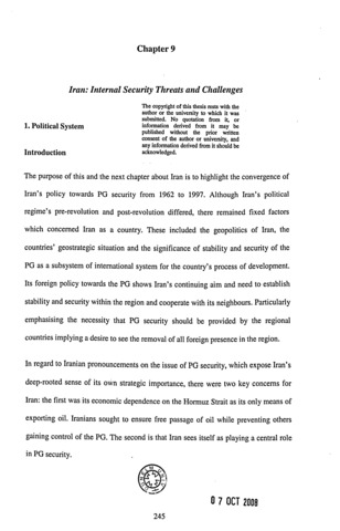 The aim of this study is to provide a conceptual and analytical foundation for a discussion about the future shape of security arrangements in the Persian Gulf. The Persian Gulf is a regiion whose strategic and economic characteristics have strengthened its vital significance to all littoral states as well as the entire world's economy and political life. Its significant geopolitical situation, in addition to its dominant position as an energy source and gateway for global energy has caused this region to be a worthy rival to outside powers, particularly the West, while also being the most unstable and chaotic of any world region. Therefore the objective of this thesis has been to provide a security model for the Persian Gulf that address the need for a stable and peaceful structure of relationships which will provide security for all individual littoral states, as well as assuring the interests of the external powers. The thesis' hypothesis of cooperation as the only possible basis for a comprehensive strategy for peace and stability in this region has been substantiated by employing a variety of conceptual and analytical tools to understand the reasons for the failure of security models 'in the Persian Gulf and to confront the huge obstacles to a security system for this region. The relevance of this model is supported by the modem global political landscape, most especially the events that have occurred since the end of the 11 Cold War, in addition to various successful cooperation models that are to be found in other regions of the globe, e. g. the EU. This is assisted by the unprecedented opportunity for regional cooperation and the conditions for the creation of new security arrangements in the Persian Gulf and beyond that have been created since the downfall of Saddam's regime in 2003, which was one of the major elements of insecurity in this region. To this end, this study has analysed various security models in this significant geopolitical region in the world since 1962, with special reference to Iran's foreign policy. Particular reference has been made to Iran because of its geostrategic and geopolitical situation and as the hegemonic power in the Persian Gulf, which regardless its political regimes, it has great national and security concerns and plays a determinant role in peace and security of the region. With emphasis on dialogue as the best solution to the regional security problems in the Persian Gulf, this study has come up with a pyramid security model on the basis of the region's geopolitical realities which emphasisesth e need for domestic reforms as well as interaction and cooperation and a balance of interests between all regional and non-regional players.